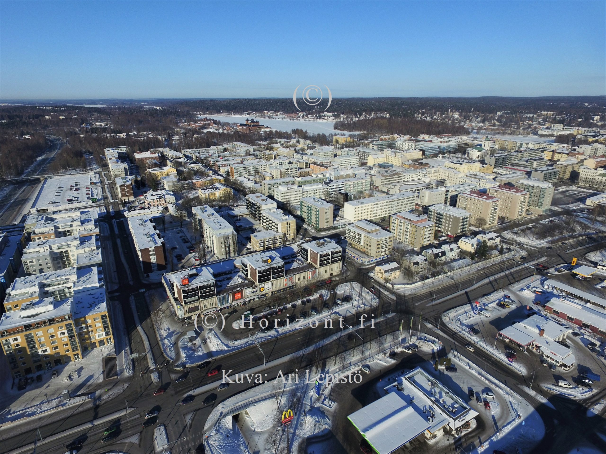 Hämeenlinnan keskusta kuvattuna kirpeänä pakkaspäivänä. Alue rajoittuu moottoritien, pääradan sekä Vanajaveden väliselle alueelle. Keskustan maamerkkejä ovat Helsinki-Tampere moottoritien päälle levittäytyvä Goodman kauppakeskus, torin itälaidalla oleva valkoinen kirkko sekä kuvissa taaempana sijaitseva 1200-luvulla perustettu Hämeen linna. Hämeenlinnan keskustan katuverkko perustuu C.L. Engelin kaupungin palon jälkeen vuonna 1832 laatimaan ruutukaavaan. Kaupungin väkilukuun suhteutettuna keskusta on melko suuri ja tiiviisti rakennettu.