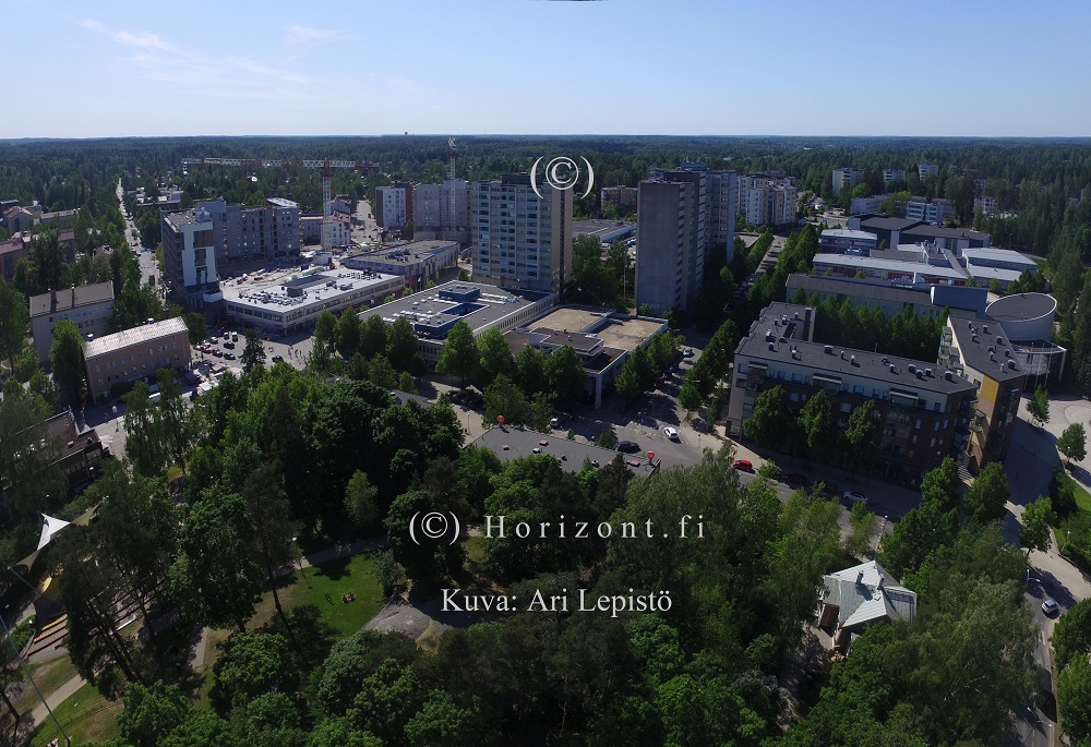 Keravan keskustaa Aurinkomäen yläpuolelta kuvattuna. Aluetta ympäröivät useat säteittäiset kadut, ja keskustan halki radan ali…